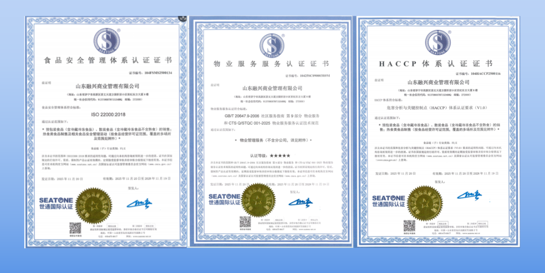 为进一步提升精益化管理水平、强化品牌核心竞争力。近日,融兴商业经过多轮专业审核,在已完成质量管理体系、环境管理体系、职业健康安全管理体系三大体系认证的基础上,又通过了ISO22000食品安全管理体系认证、HACCP危害分析与关键控制点体系认证及物业服务体系认证三项权威资质认证。此次体系认证的成功标志着公司在物业服务规范化运营与食品经营安全管控两大核心领域的双重突破,为公司高质量发展筑牢坚实屏障。
