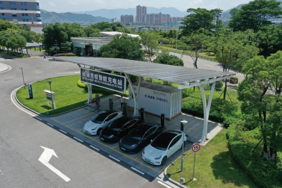 宁德时代大楼的光储充检智能充电站。