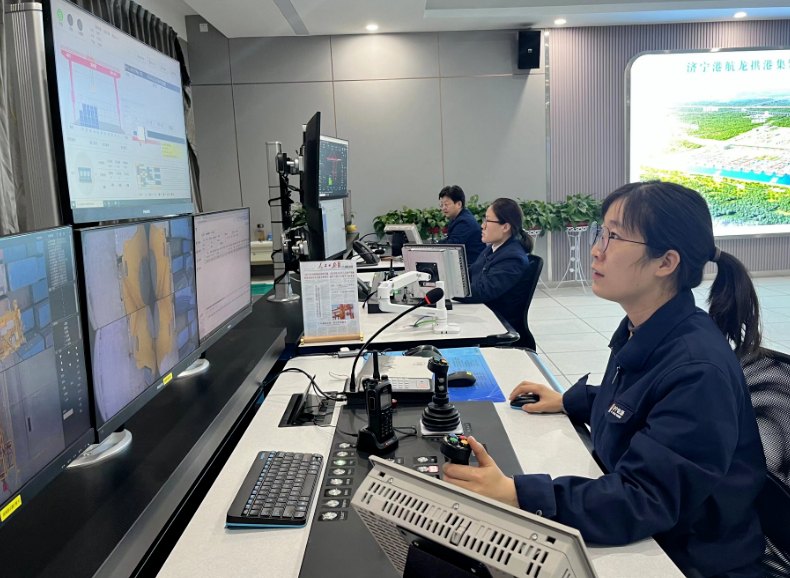 走进龙拱港远程控制中心,济宁市巾帼文明岗的女司机们正在聚精会神地操作。“集装箱作业高效、智能,两分钟轻松完成一个30吨集装箱的装卸船作业。1名司机可同时操控4台轨道吊作业,效率比传统方式提升80%。”岸桥司机付绢绢自豪地说。
